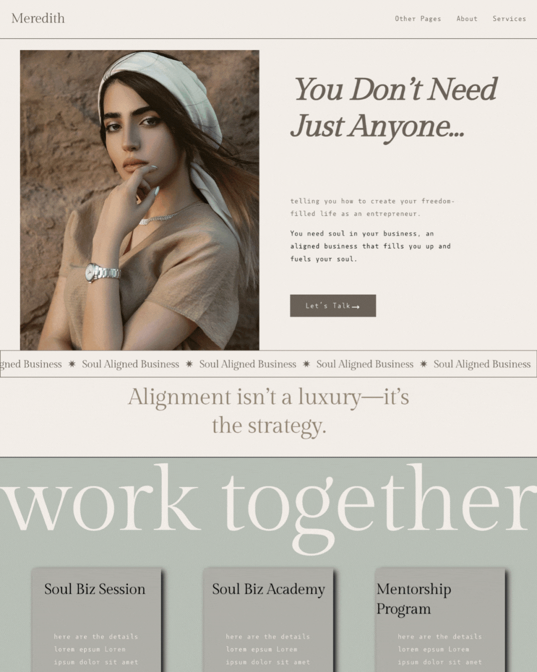 Stop settling for templates that dull your light. Meredith elevates the essence of your work with intentional design and a grounded flow that invites connection. This is what happens when soulful aesthetics meet strategic clarity—your presence feels undeniable, and your dream clients feel right at home.